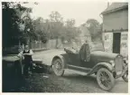 Fotografi från expedition till Peru 1920. Motiv av två män och tre kvinnor i en bil på en grusväg.