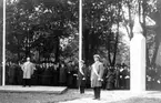 Konung Gustav V i samspråk med borgmästare Yngve Malmquist. I bakgrunden till vänster ses Birger Jeansson.