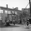 Brandövning på Brahegatan nedanför Gränna torg. Två män sprutar norrut med vattenslangar. En folksamling, i huvudsak män, står bakom och tittar på. På husknuten till Brahegatan 41 sitter en skylt: Mobiloil.