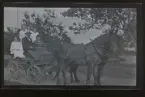 En man på en vagn dragen av två hästar. "Edvin Karlsson, Fogelstad. "
