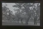 "Gustav Karlsson kör höskrinda, 2 bläsiga fuxar."