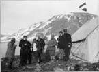 Samling kring kamera på HMS Svensksunds akterdäck: Stake, Ehrensvärd, Machuron, Celsing, Strindberg, Norselius samt Lembke.