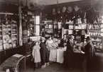 "Interiör från Greens affär i Kiruna 1903. Kunder och expediter på var sida om disken En mängd olika varor exponeras på hyllor och krokar."