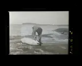 Fotografens anteckning: Drängen Gottfrid P:son (Pettersson) i säljagtsdrägt i Byviken.
