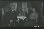 "Familljen Olsson, Äs smörkörare på Äs mejeri." Porträtt av an man och två kvinnor sittandes i ett hem.