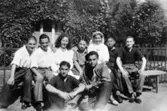 "Karantänsförläggning" på Kvarnbyskolan för flyktingar från koncentrationsläger i Tyskland 1945. Sju manliga flyktingar med två sköterskor utomhus.