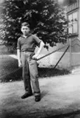 "Karantänsförläggning" på Kvarnbyskolan för flyktingar från koncentrationsläger i Tyskland 1945. En pojke som står utomhus.