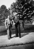 "Karantänsförläggning" på Kvarnbyskolan för flyktingar från koncentrationsläger i Tyskland 1945. Två män utomhus.