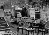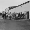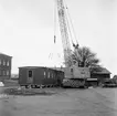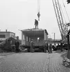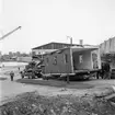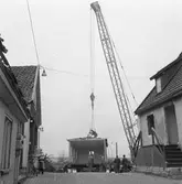 Hösten 1949 flyttades den gamla busstationen från Jakobsgatan till motorbanan. Bärgningsplutonen från P¤ i Skövde skötte transporten. Här har man kommit upp förbi Hästbackens småstugor.