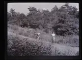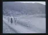 Dräkt. "Lund den 21 Mars 1826" (? sista siffran svårläst)". Fotgängare och män till häst på en väg. Tuschteckning i storformat av G.W. Palm.