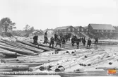 "Stöddragning" av timmer framför det gamla vattendrivna Sågverket i Ljusne. Vita byggnaden i bakgrunden, förvaltarbostad med kontor.