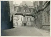 "Det underbara Dresden". Vy från en del av slottet i Dresden. Man ser en täckt bro över en gränd. Vid ingången till höger syns en kvinna (Margareta Bergstedt, g. Lidén) i klänning och hatt. 1889 färdigställdes en gångbro i trä mellan slottet och Hofkirche, i folkmun kallad Seufzerbrücke, "suckarnas bro", efter förlagan i Venedig. Den ditintills namnlösa gränden under bron uppkallades 2007 efter hovkyrkans arkitekt Chiaveri.