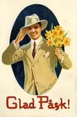 Kort: "Glad Påsk tillönskas". Pojke som sitter på en trappa och spelar dragspel.