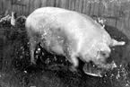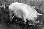 EN ÄLDRE KVINNA SOM MATAR GRISAR