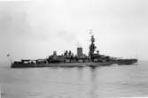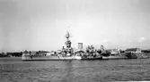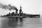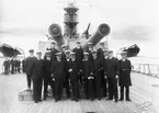Från kung Gustaf V:s statsbesök i Estland 27 juni 1929, monarken hälsar på estniska representanter ombord på pansarskeppet SVERIGE i Tallinns hamn.