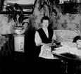 Interiör med arbetande kvinnor, tillverkning av bögsäcksfässlor, flätning, slingning, i Gruddbo by. I bakgrunden sitter en kvinna vid en vävstol.