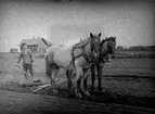 HARVNING MED PARHÄSTAR, SANNOLIKT ANVÄNDER MAN EN GÅSFOTAHARV. EN MAN GRÄVER MED EN SPADE.