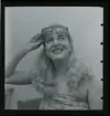 Modevisning Nordiska Kompaniet. Kvinna i lång, mörk klänning och päls med vida ärmar lämnar blombuketter till en sittande publik.