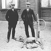 Tre jägare med gevär och kaniner och fåglar. Arthur Hallberg, född1885-08-07 i Ohio, USA, död 1963-08-13 i Svennevad. Amandus Hildor, född 1876-07-23 vid Södra Sättra i Svennevad, död 1962-11-23 vid Olaus Petri församling i Örebro. Anton Hallberg, född1890-03-26 i Ohio, USA, död1984-01-30 vid Norra Hyddan i Svennevad. Arthur var gift med Amandus syster Hilda Johansson, född 1882-10-07 vid Pellagården i Svennevad, död 1951-10-13 i Örebro.