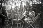 TORSTEN JOHANSSON, ÄSPÄNG FREDSBERG MED SIN FAMLIJ DRICKER KAFFE UTOMHUS, KANSKE PÅ EN HEMBYGDSFEST.