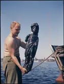 Vasamodellen i skala 1:10. Galjon och bogspröt. Den övre delen av galjonen visar en rad romerska kejsare, på den nedre finns en lång skulpturfris som återger den grekiska sagan om Thetis och Peleus.