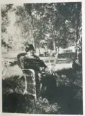"Moster Sally. 1928". Fröken Sally Eksandh har slagit sig ner i en korgstol i Strandbjörket.