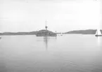 Flygbild på nära håll av fartyget H.M. Sverige till sjöss, 1922.