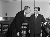 "Cyklotronen mäktigt vetenskapligt instrument", från invigningen av Gustaf Werners institut för kärnkemi, Kåbo, Uppsala december 1949. Kronprins Gustav Adolf i samtal