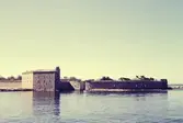 Vykort på Kungsholms fort. Fortet är i många avseenden unikt. det har varit bemannat av svensk trupp i 300 år utan något avbrott och det har varit bemannat under alla krig i Nordeuropa sedan 1680, men aldrig avlossat ett enda skott mot någon fiende. Byggnationen kring Norra Redutten med båthamnen, donjonen och högvakten saknar motsvarighet i Sverige.