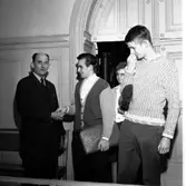Studentfinal, 1944. Studenter m.fl. på trappan till dåv. Växjö Högre Allmänna Läroverk. Angående avgångsklassen 1944 - se "Lärare och Studenter vid Växjö Högre Allmänna Läroverk, 1850-1950" (Växjö 1951), s.174-176, 283.