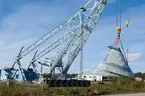 Isbrytaren SANKT ERIK bogserar pontonkranen LODBROK genom Hjulstasundet.