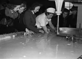 Ungdomar som deltar i en studiedag anordnad av Hushållningssällskapet och en kommitté för kvinnlig samhällstjänst på studiebesök hos Mjölkcentralen, Storgatan 19