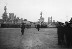 Parad med värnpliktiga på sparres kaserngård. Till vänster i bild syns högre militära tjänstemän och befäl som står omkring och på ett podium.