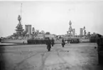 En grupp uniformerande, vapenbärande flottister går läng Drottninggatan, ledda av en löjtnant som håller upp en stor, svensk flagga. Vid sidan av vägen står civila åskådare och ser på. Kyrkparad för nyinryckta värnpliktiga.