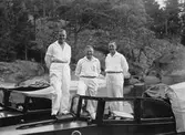 "Några E-kanoter från Ålstens Båt Sällskap omkring år 1950"; "Motorbåten i bakgrunden troligen Allan Rosengrens"; "Den vita E-kanoten troligen 'Hjorten'"