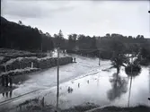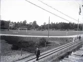 "Idrottsplan Munkedal omkring (?)." "I bakgrunden till vänster Gustav Hedlunds hus."