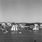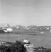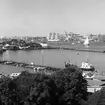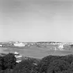 Från Blockhusudden åt sydost. En bärplansbåt passerar Bergs oljehamn i Nacka.