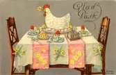 Kort: "En treflig Påsk vi önskar dig - Med ägg och pussar evinnerlig! Glad Påsk!" Tupp och höna som drar en vagn med ägg.