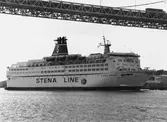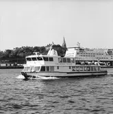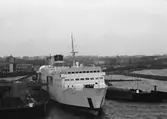 Foto i svartvitt visande bil & passagerarmotorfärjan Prinsessan Margaretha i Köpenhamn under april månad år 1955.