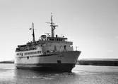Foto i svartvitt visande bil & passagerarmotorfärjan Prinsessan Margaretha i Köpenhamn under april månad 1955.