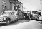 Paketsäckar lastas in i möbelbuss från Kungsholms Express. Längst till höger förste kontrollör Gunnar Lagerberg och postassistent Åke Sjögren, postdirektionen Stockholms D., vilka hjälper till med lossning och lastning.