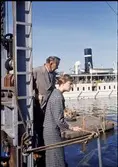 Foto i svartvitt visande bil & passagerarmotorfärjan Prinsessan Margaretha i Köpenhamn under april månad år 1955.