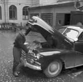"Trafiksnurran" biltävlingens förste pristagare Tage Persson vid en Chevrolet 1947-1948. 27 mars 1954.