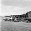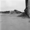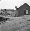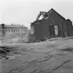 Parti av Linköping. Vy mot kvarteret Däckeln sett från korsningen av Nygatan och Tanneforsgatan. Bilden visar den påbörjade rivningen av kvarterets trähusbebyggelse.