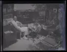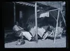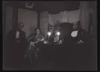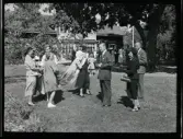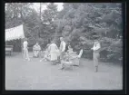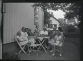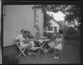 Ett sällskap sitter ute och fikar i en trädgård.