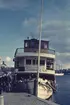 Södra Blasieholmshamnen, nu Strömkajen. Sommarflyttande stockholmare lämnar staden och åker ut till skärgården. En mamma går med sitt barn över skärgårdsbåtens landgång. I bakgrunden Palmeska huset.