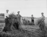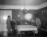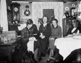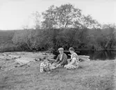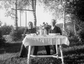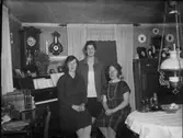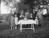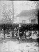 Ett äldre par (föräldrarna) poserar med sin son framför sitt bostadshus. I rabatten vid kvinnans fötter skymtar en s.k. skrattkula av glas.