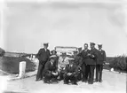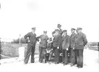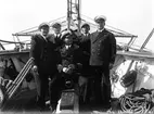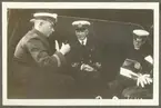 Bilden visar en amiral och sjöofficerare som har tagit uppställning ombord på pansarskeppet Sverige under besöket av kung Gustav V. I bakgrunden syns ett flertal fotografer som dokumenterar händelsen.