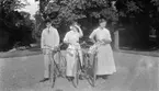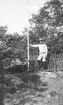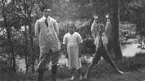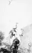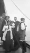 En ung kvinna, klädd i någon slags "zigenardräkt" bjuder runt något på ett fat. Till höger syns en intresserad ung herre. Suddigt foto.