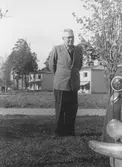 Engelsk lärare 6 april 1966 En lärare i engelska står framför svarta tavlan i klassrummet. Till vänster står en kateder och en stol. Framför läraren sitter elever i skolbänkar. or. Han går nedför en kort trappa utomhus.